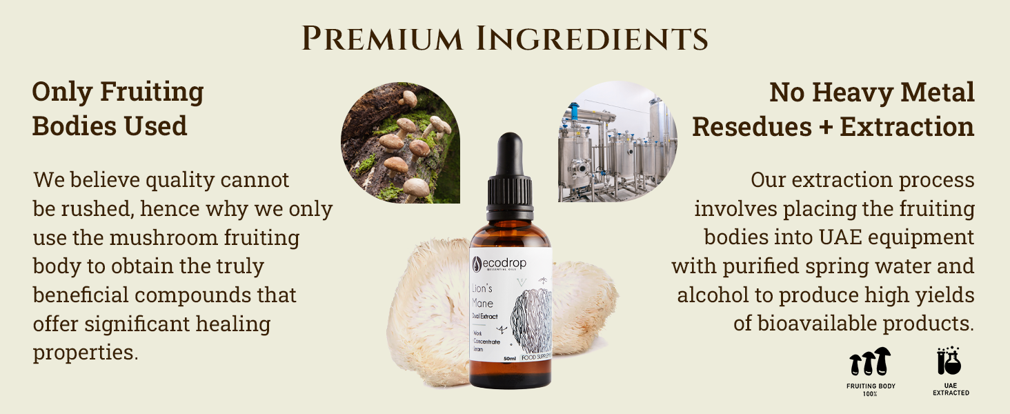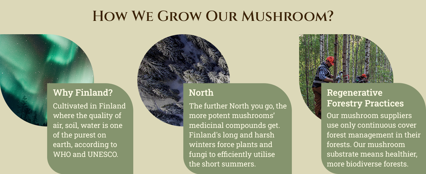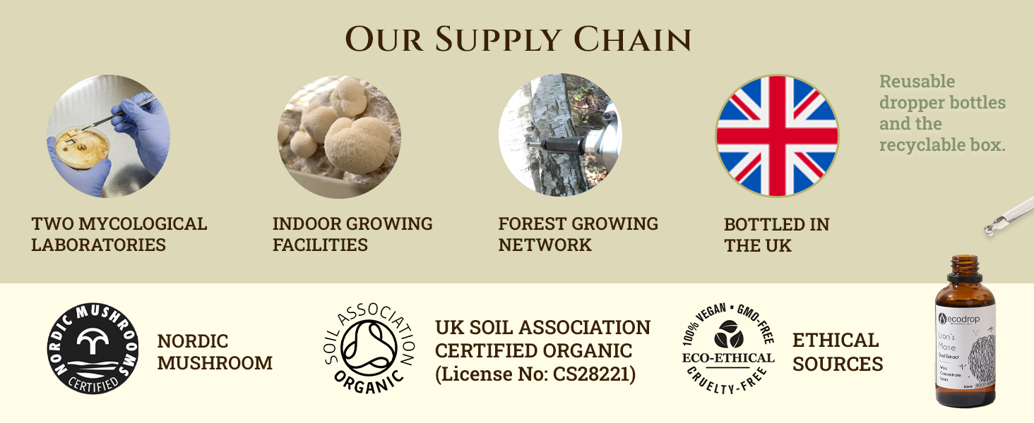 Our lion's mane mushroom extract supplement is crafted from organically grown mushrooms using sustainable, traceable methods. This lion's mane mushroom extract undergoes a dual extraction process in Nordic facilities to preserve its natural compounds. Always vegan, cruelty-free, GMO-free, and rooted in ethical sourcing practices from start to finish.