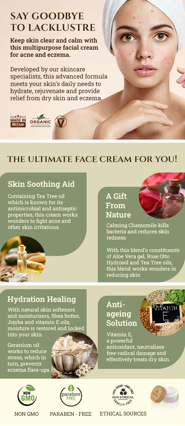 Kind to Skin, our vegan, organic and eco-friendly package face cream soothes acne and eczema. Luxuriously smooth and non- greasy, this chemical-free formula provides essential nutrients to repair and hydrate, keeping skin healthy.